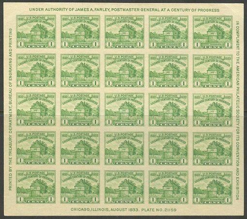 This week we feature the American Philatelic Society Souvenir Sheet issues of 1933. This is the first souvenir sheet ever issued by the United States Postal Service. Both were printed to honor the American Philatelic Society for their convention and exhibition in Chicago Illinois. This event was part of the city’s Century of Progress Exposition.
