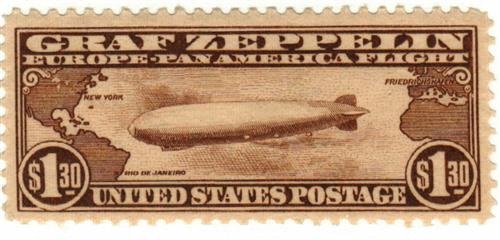 This week we feature the Graf Zepplin Issue of 1930. The three stamps of this issue were printed by the Bureau of Printing and Engraving using a flat plate printing method. The United States Post Office produced a set of three airmail postage stamps that commemorated the Graf Zeppelin, the first European-Pan-American round-trip flight in May of 1930. All three stamps were first issued in Washington D.C. on April 19, 1930, one month before the historic transatlantic first flight was made. The stamps were also placed on sale at other selected post offices on April 21, 1930.