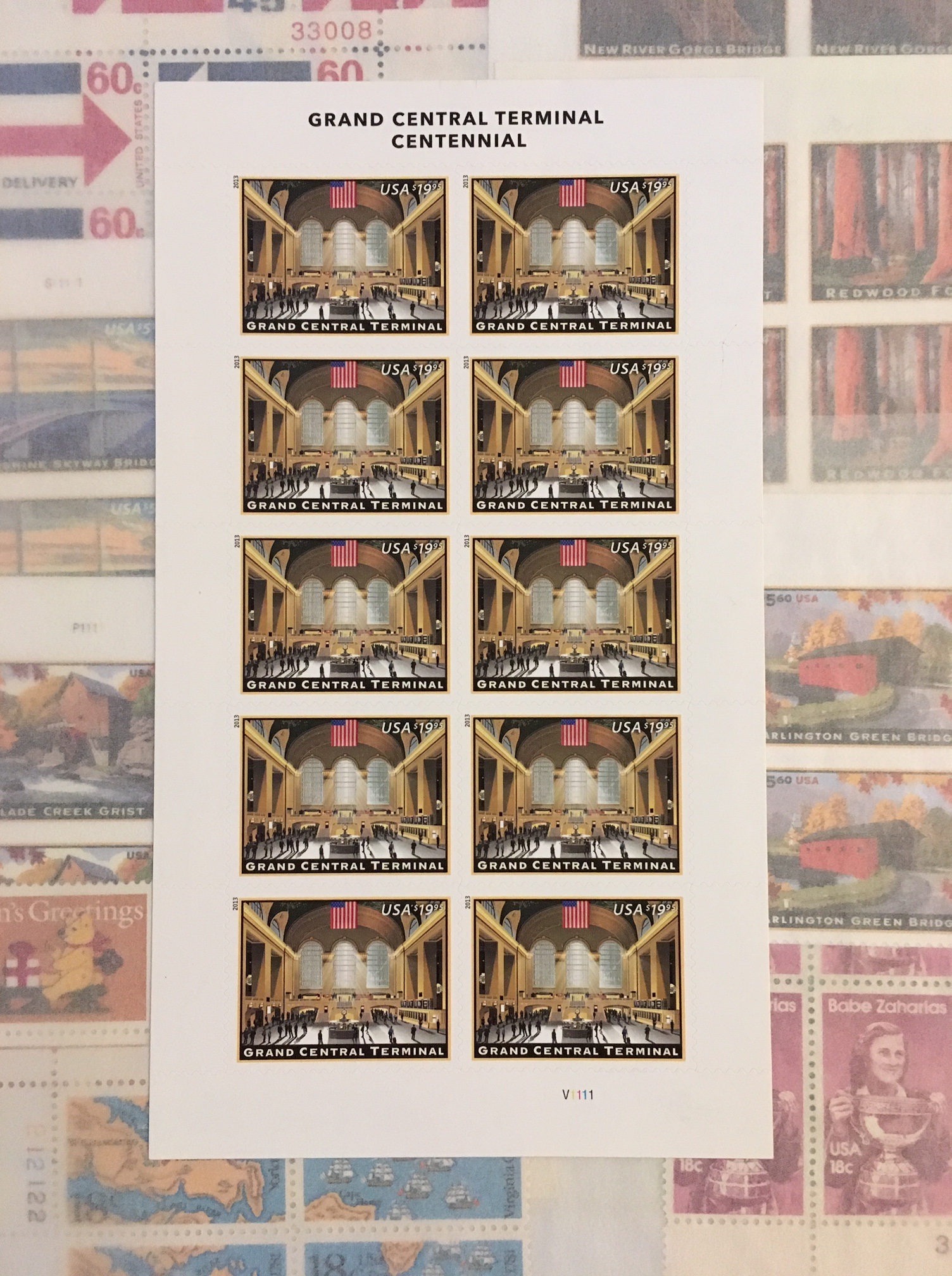 This week we feature the Priority Express Mail Stamp Grand Central Terminal, New York. It is part of the American Land Marks Series launched in 2008. It was designed by Derry Noyes and Phil Jordan. The print run of 3,000,000 stamps was done with the photogravure process. The printer was Avery Dennison. These stamps were printed at the company’s Security Printing Division plant in Clinton S.C. These issues have the highest face value of any U.S. Postal Service stamp.