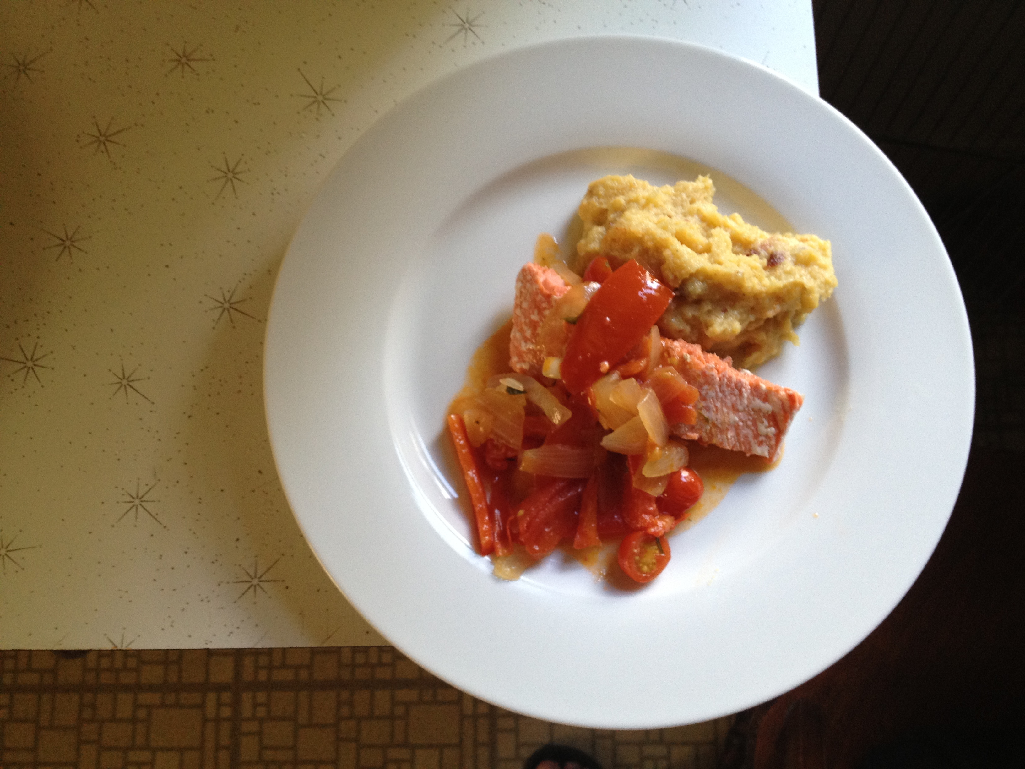 Day three, an Italian spin on poached Silver Salmon. With another chill in the air again, polenta was on everyone’s mind. A creamy pile of yellow corn meal polenta perfumed with the pungent flavor of roasted garlic, dry porcini mushrooms and home made chicken stock was the starch of choice on one side. On the other side, the last of the garden tomatoes, basil, and first pickings of the garden’s onions, were quickly cooked up into a fresh, chunky tomato sauce. The salmon was seasoned with salt and pepper and a a few splashes of Orvieto wine when it went into the oven. I wanted the sauce and the side to add the major flavor elements.