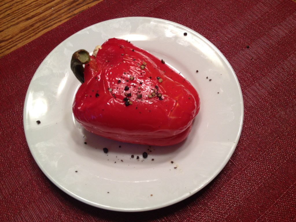 The peppers were cleaned and the insides lined with a thin slices of prosciutto rubbed with olive oil and sprinkled with a little thyme. Then it was filled with a seafood stuffing. Scallops, shrimp and clams were sauteed with chopped thyme and shallots, finished with a few splashes of dry white wine and folded into a pile of fluffy ricotta and a small portion of shredded fresh mozzarella. I put the stem back in place, brushed the outside of the pepper with olive oil and baked it until the flavors developed and came together in the transformative heat of the oven. It was sprinkled with cracked black pepper when served.