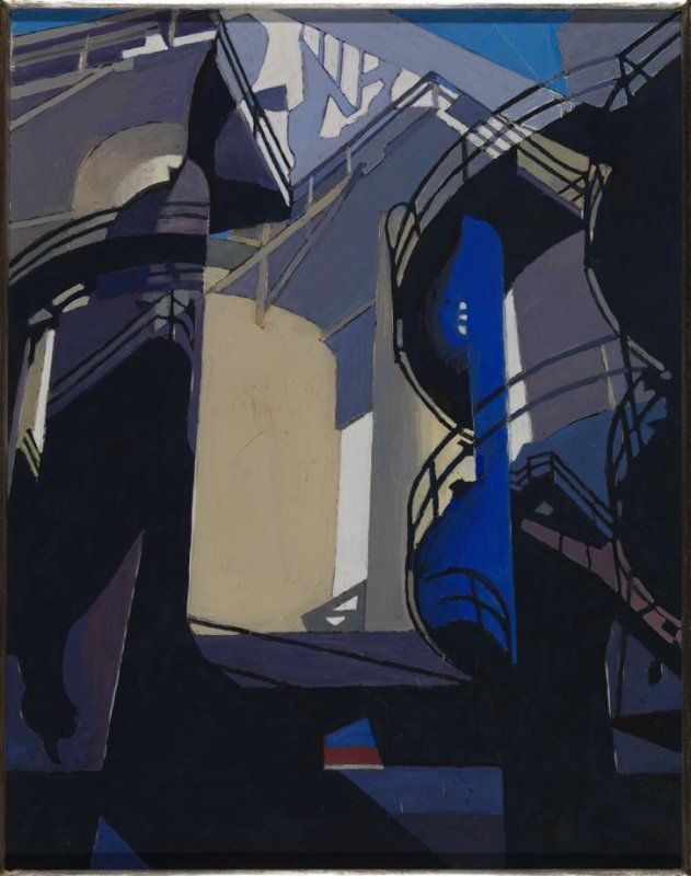 First, Precisionists paint artificial landscapes and emphasize the geometrical forms within those landscapes. The square, blocky proportions of a factory, the multiplicity of curves formed by storage tanks, and the sweeping arcs and angles of a steel bridges become their landscapes.