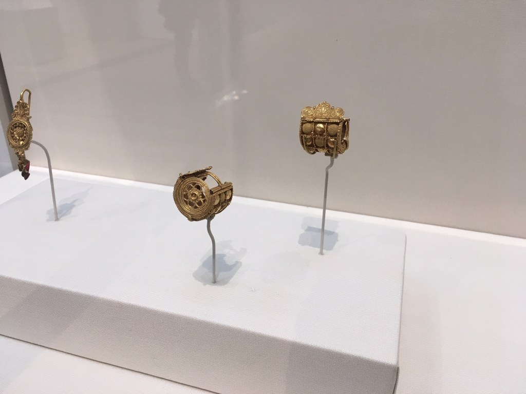 Below are Etruscan earrings dated from the fifth century BC. The level of detail and craftsmanship in this jewelry was impressive. I often think of ancient cultures as not being as sophisticated as modern cultures. But seeing all the objects in this exhibit, made thousands of years ago, had reminded me that aside from scientific, technological and economic understanding, and perhaps a few other ares of knowledge, this is not true.