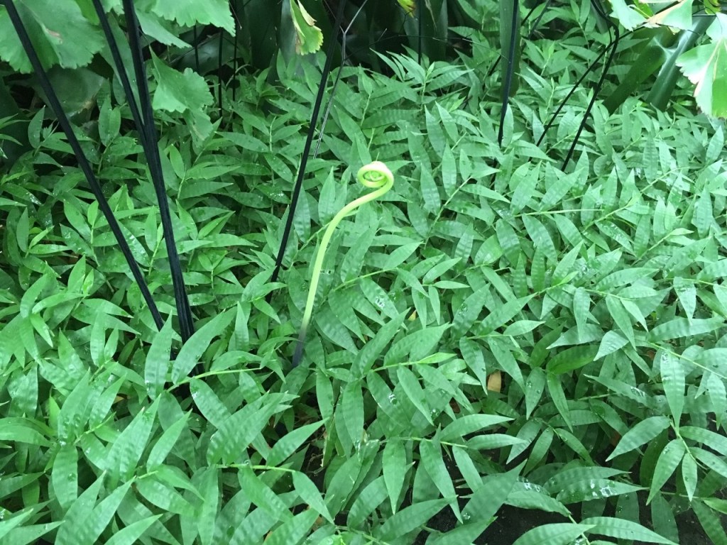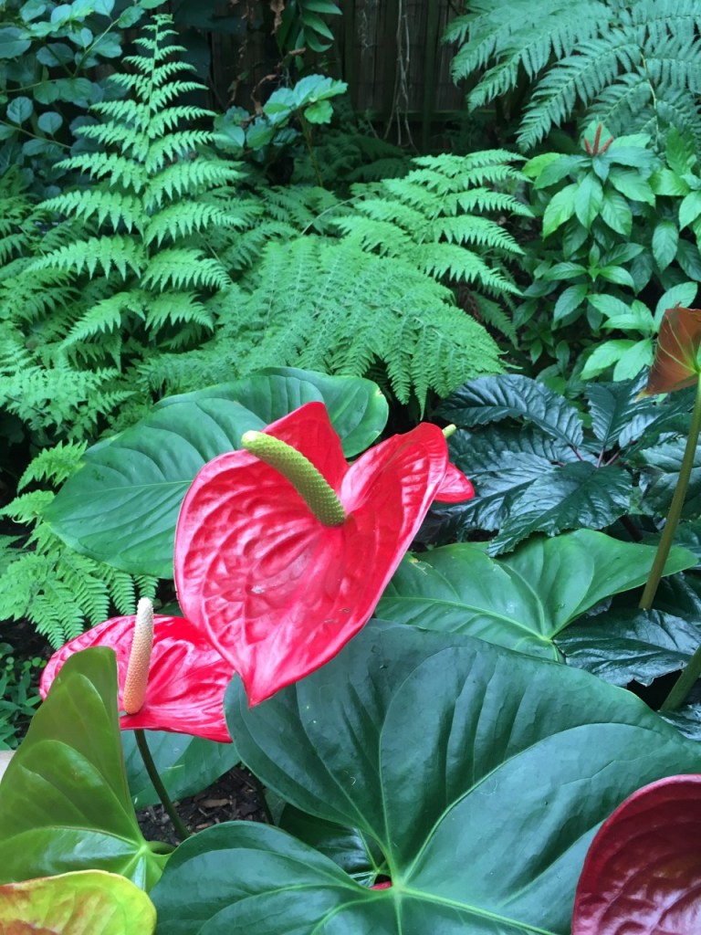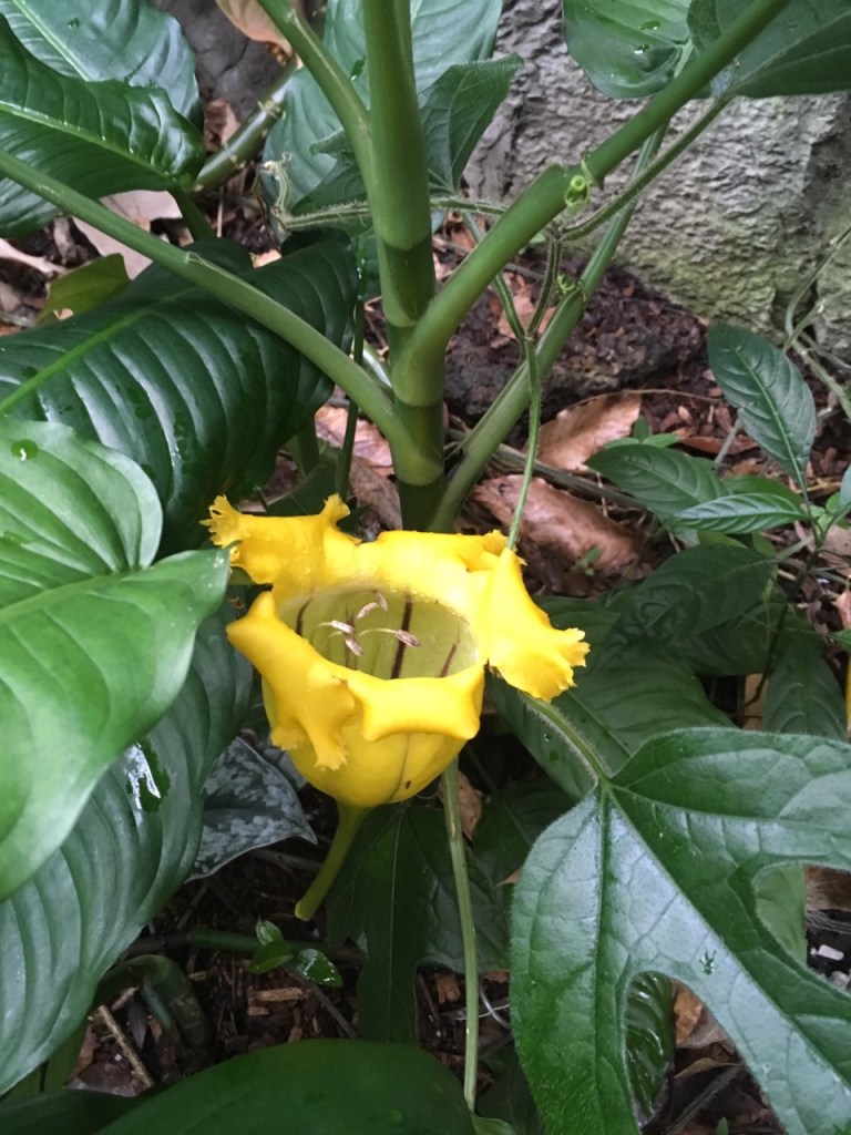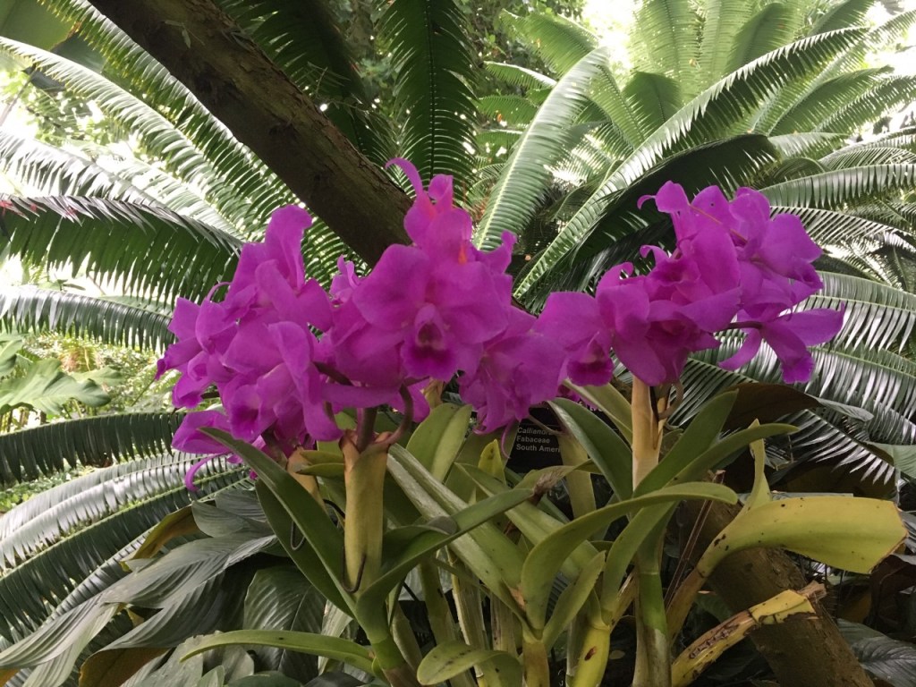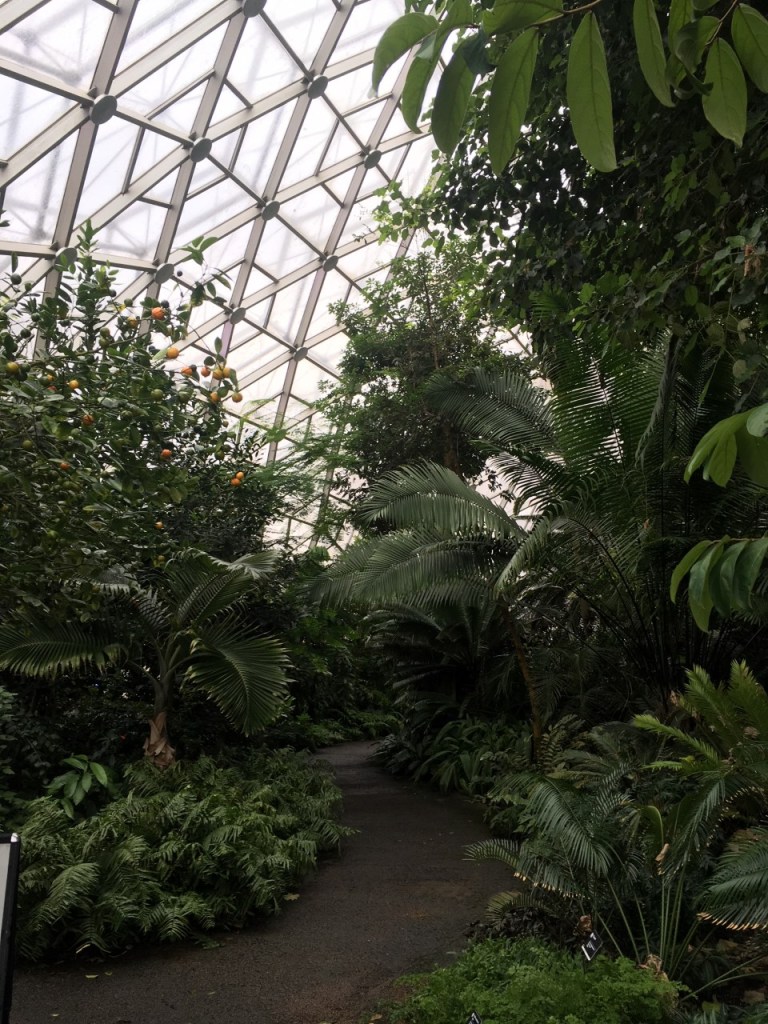 Stepping into the conservatory the dry, chilly air of late autumn was replaced with the heavy, moisture laden air of the tropics. We were shaded by full grown trees and surrounded with dense green foliage replete with strange and wonderful flowers, the likes we had never seen before. Flowing through this super sized terrarium was a stream with a waterfall as well as small pools supporting a variety of water plants. I even saw a big gecko clinking to the side of a tree like a garden decoration and heard a bird calling in the canopy above.
